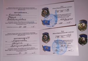Мария Коропова, отлично выполнившая нормативы комплекса «Ворошиловский стрелок», награждена знаком «Юный Ворошиловский стрелок», а также получила право на ношение отличительного знака ДОСААФ России «Стрелковый спорт».