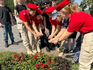 К участию в акции присоединились кадеты ВПК «Беркут» и руководитель клуба, активистка «БОЕВОГО БРАТСТВА» Мариетта Микитась. Ребята набрали воду из чаши в ладони и полили из рук цветы рядом с мемориальным комплексом «Журавли» в городе Кисловодске.