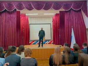 Ветеран боевых действий в Афганистане, волонтер, член «БОЕВОГО БРАТСТВА» Виталий Цымбал обратился к ребятам с речью, в которой подчеркнул важность борьбы с нацизмом в современном мире, а также выразил благодарность школе за участие в волонтерском проекте для жителей Новой Каховки. В ходе беседы гость подчеркнул, что каждый может совершить посильное дело для того, чтобы в мире стало больше добра.