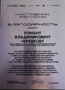 В ходе мероприятия Роман Черевков получил благодарность Всероссийского общественного движения «Волонтёры-медики» за поддержку, участие и вклад в развитие культуры медицинского добровольчества в России.